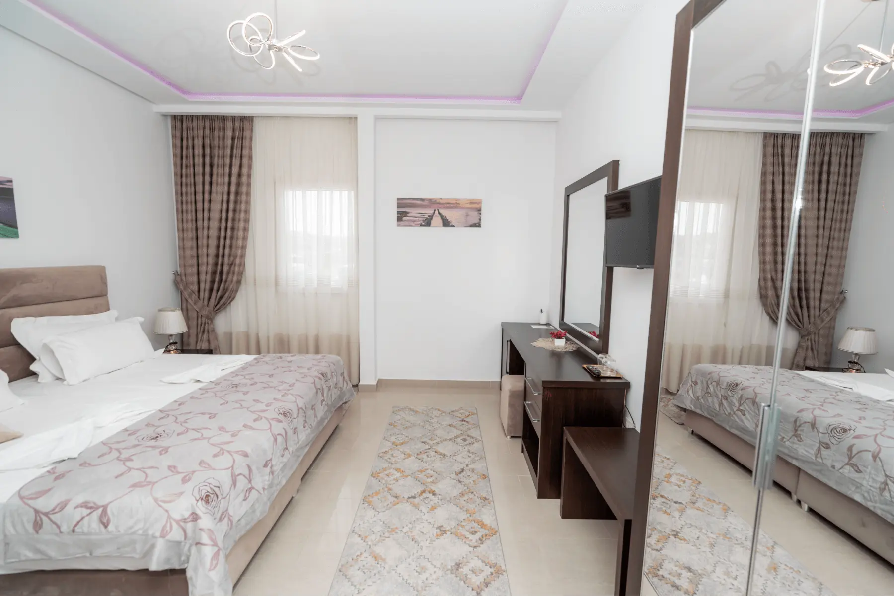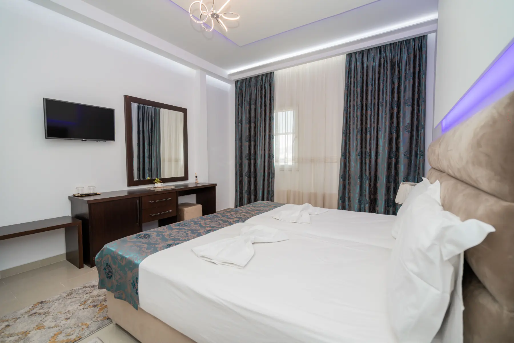 Kur hyni në një dhomë standarde, do të përjetoni një moment të këndshëm dhe paqësor të ofruar nga kombinimi i dekorit modern dhe bashkëkohor. Ideale për mysafirët që kërkojnë një vendstrehim të qetë dhe komod.